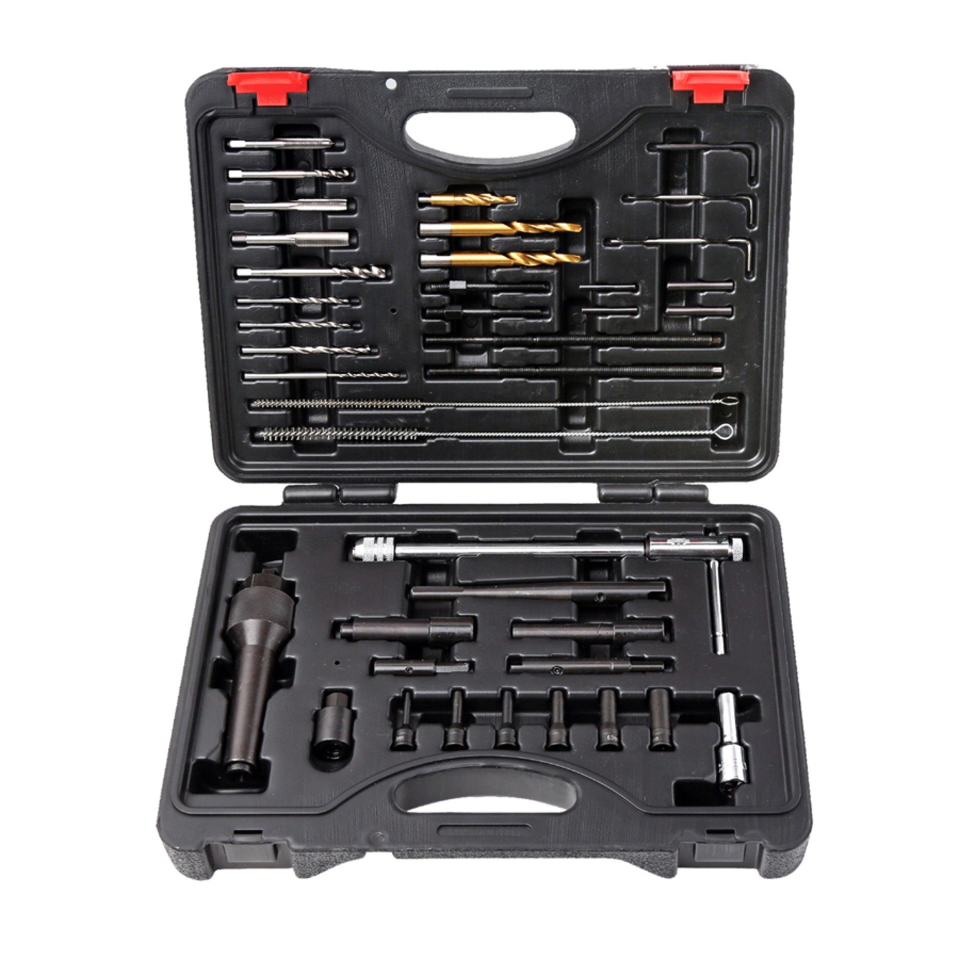 (1x) roquete em T, (3x) adaptadores de broca, (1x) carcasa extrator, (1x) parafuso de força, (1x) porca de força, (1x) chave de caixa torx, (3x) chaves umbrako em L, (4x) brocas piloto, (2x) extratores especiais (2x) adaptadores extração, (3x) machos: 1/4”, M8, M10, (1x) macho rosca esquerda, (1x) extrator de vela encandescentes, (2x) escovas de limpeza, (6x) chaves extração, (3x) brocas escalonadas,(4x) suportes de brocas, (2x) extensões para suporte broca.