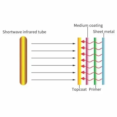 Infravermelho de ondas curtas possui alta eficácia luminosa e grande poder de penetração. Ele pode penetrar diretamente na camada de tinta para acelerar sua reação química molecular, de modo que o solvente de água na camada de tinta possa ser rapidamente volatilizado para obter uma secagem rápida de dentro para fora. Como resultado, o brilho da superfície da tinta é alto e a superfície externa é resistente à ação mecânica. Ao mesmo tempo, reduz consideravelmente manchas ou escorrimento de tinta. Reduz o tempo de secagem em até 3 vezes. Esses efeitos benéficos também são encontrados quando a massa seca.